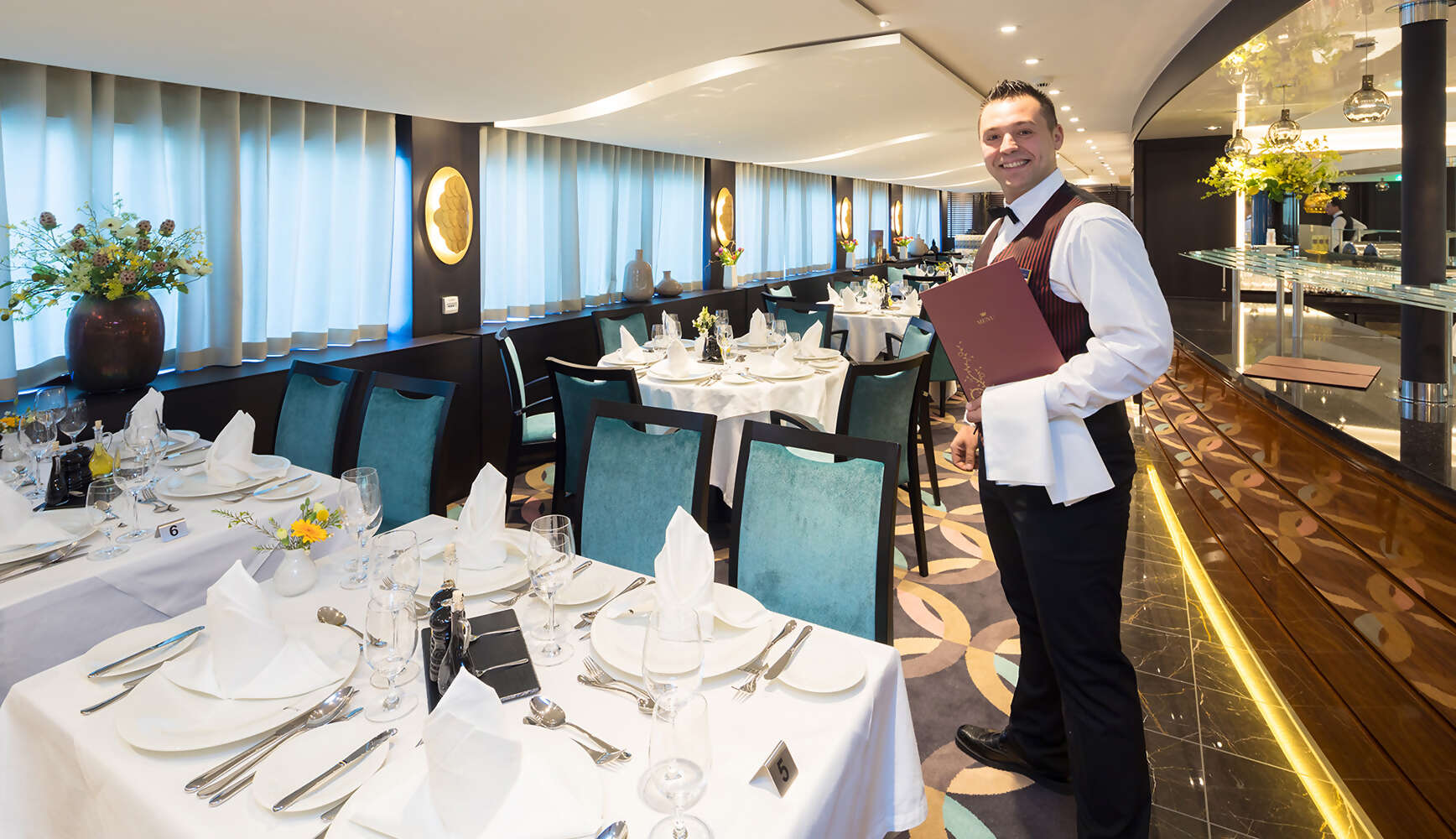 AmaWaterways award-winning AmaSonata sings her melodious tune down Europe’s great rivers. Most accommodations have twin balconies, so you can enjoy the ever-changing scenery however you wish, along with amenities like Entertainment-On-Demand, high-speed Internet access and English-language TV stations. A soft color palette in each stateroom calms the mind for relaxation, but when you’re ready to get active, head to the fitness center or up to the Sun Deck to the heated pool. Crisp white tablecloths and napkins grace the tables in the subdued Main Dining Room, while The Chef’s Table specialty restaurant highlights its 5-star multi-course cuisine with gold-hued tones and a twinkling overhead centerpiece. With a stunning Main Lounge, tranquil library, sun-deck walking track, massage and hair salon, and gift shop, you’ll never find a dull moment—and will sing AmaSonata’s praises while sailing on board.